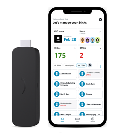 - Free Amazon Signage mobile app - set up multiple Signage Sticks faster and easier - no remotes needed. Plus, monitor all devices from a centralized dashboard.